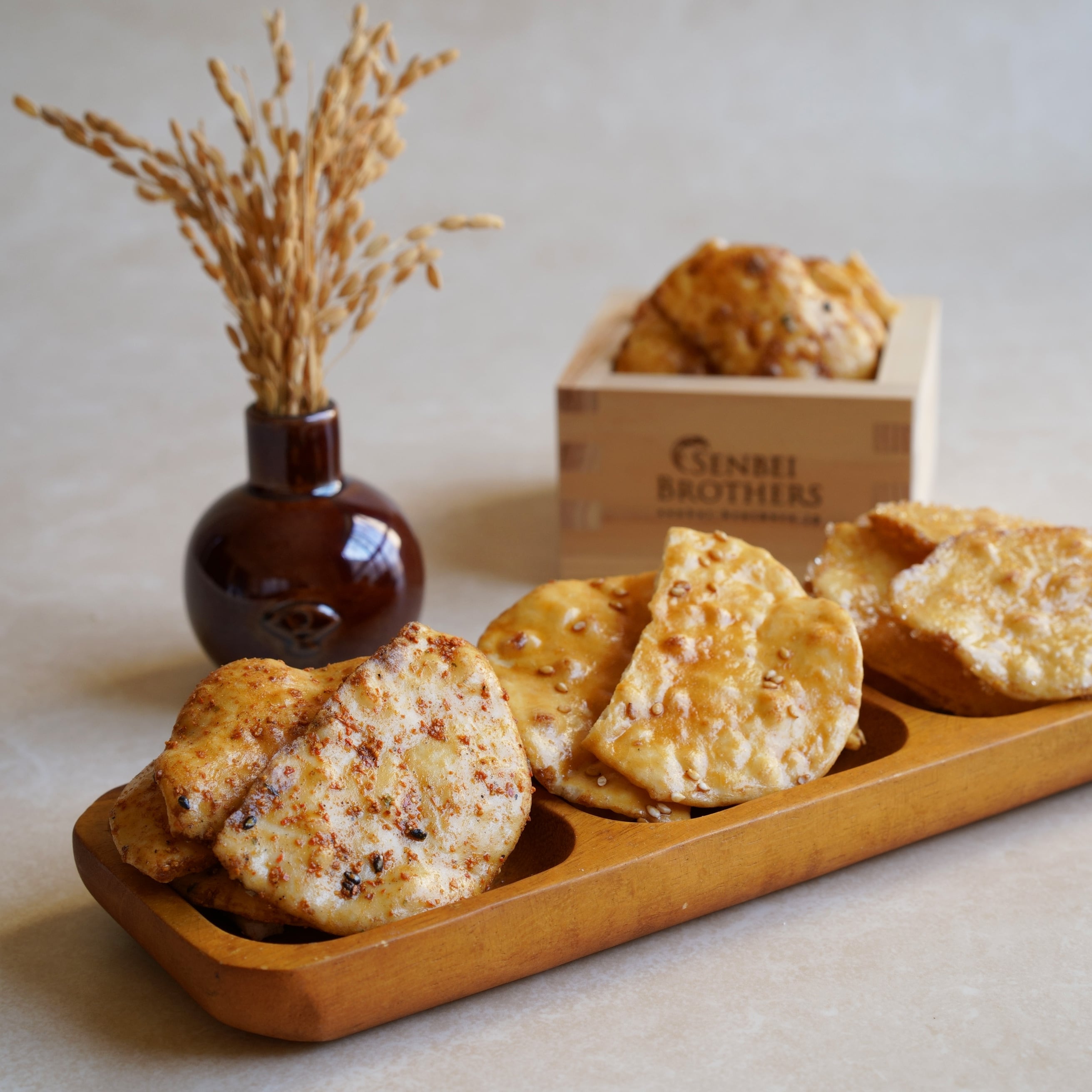 3種の煎餅(甘辛七味・白煎り胡麻・ザラメ)計6袋のアソート品(巾着入り)。