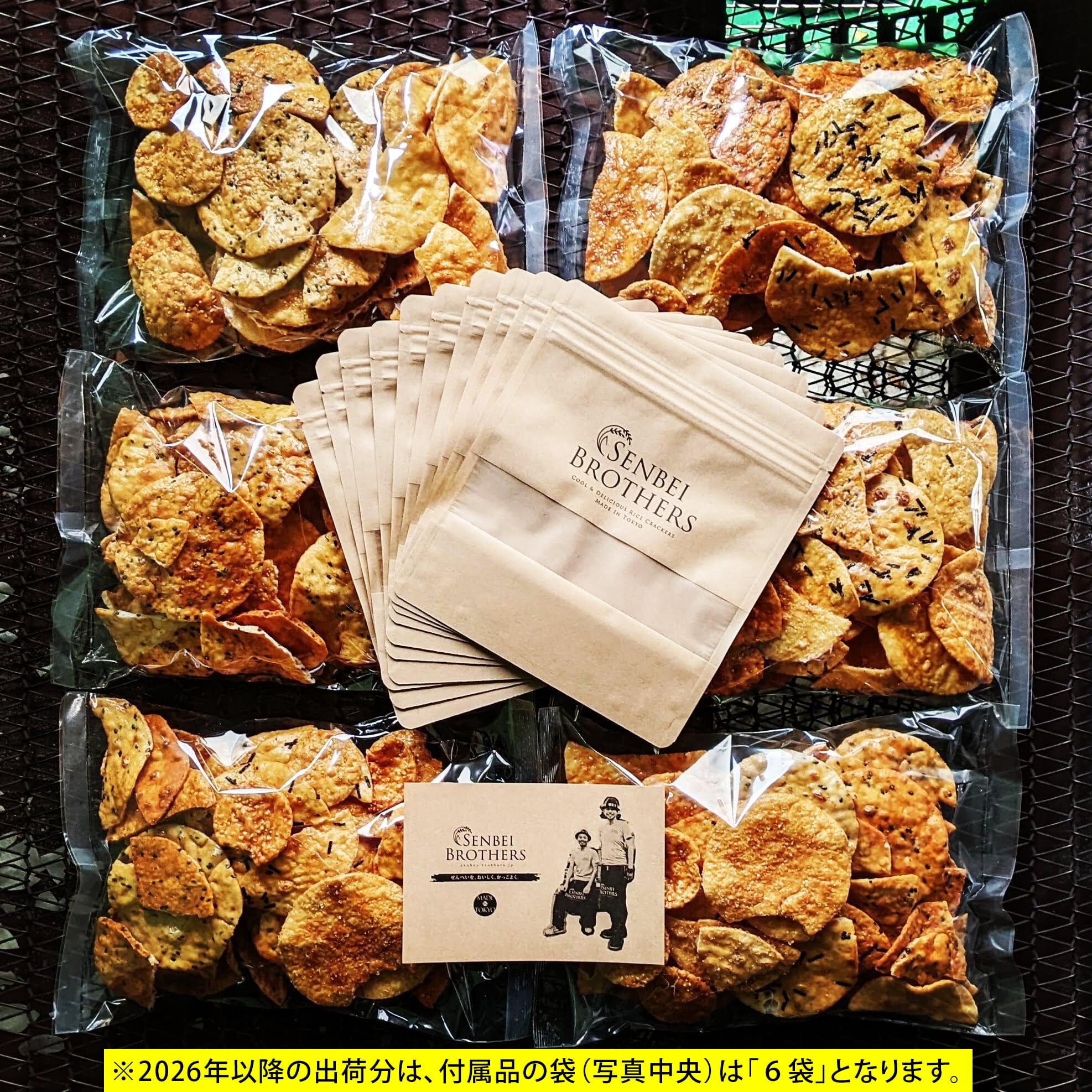 4種の味の「割れ煎餅(醤油、ゴマ、ザラメ、きり海苔)の大袋(6袋)」と「小分け用のジッパー付き小袋(6袋)」を、一斗缶にまとめたアソートセット。